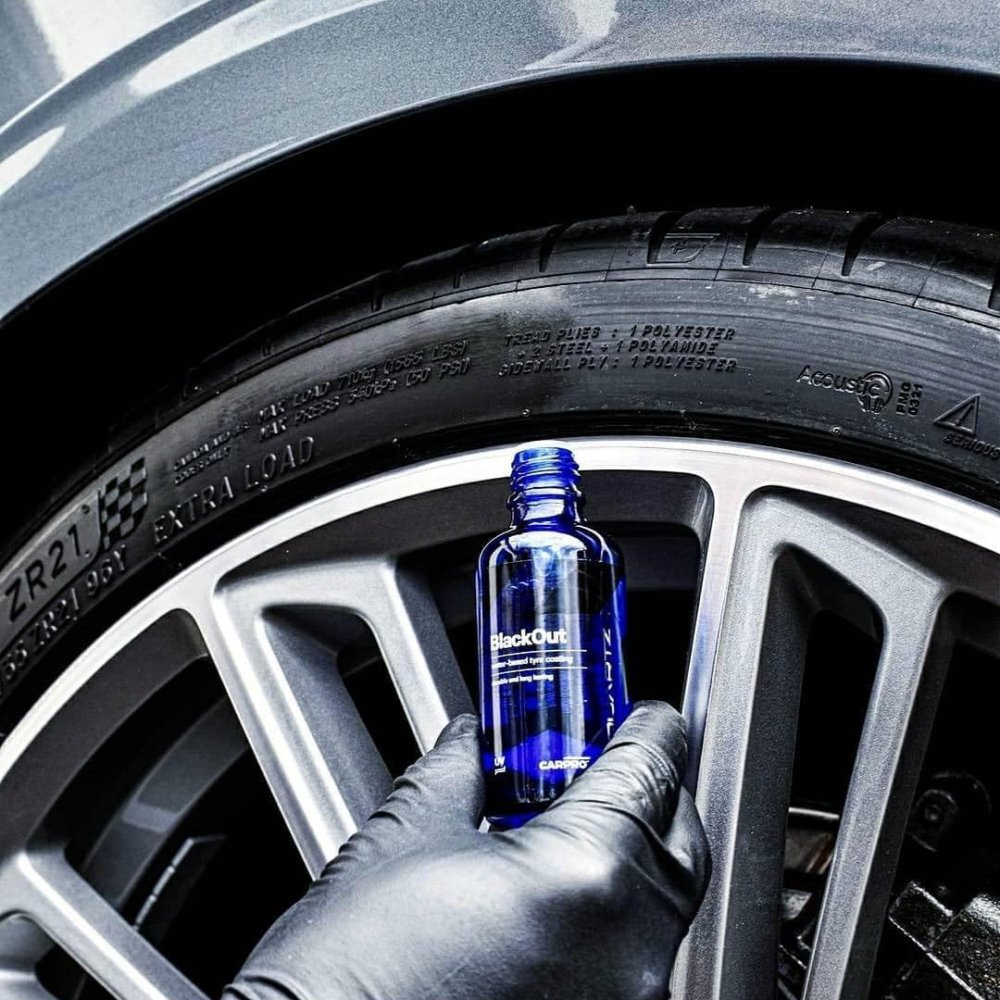 CARPRO CQUARTZ BlackOut je bezkonkurenční přípravek pro dlouhodobé ošetření pneumatik. Propůjčuje pneumatikám impozantní saténový vzhled, čistotu a ochranu po dobu cca 6 měsíců. Chrání před UV zářením, degradací a žloutnutím, obnovuje vzhled, odpuzuje vodu, prach i bláto a zásadně usnadňuje čištění. Odolává soli, otěru i opakovanému mytí.